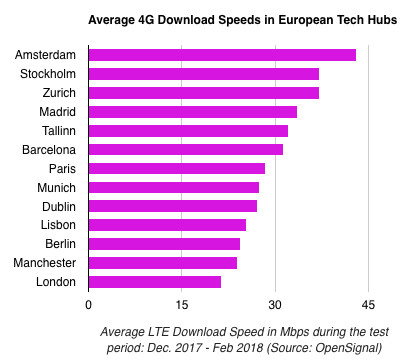 Este ránking, encabezado por Ámsterdam con una velocidad media de 43 Mbps, ha sido realizado para conocer qué prestaciones de conectividad inalámbrica proporcionan las ciudades europeas que buscan posicionarse como tech hubs, es decir, de ubicaciones en las cuales establecer una compañía tecnológica.