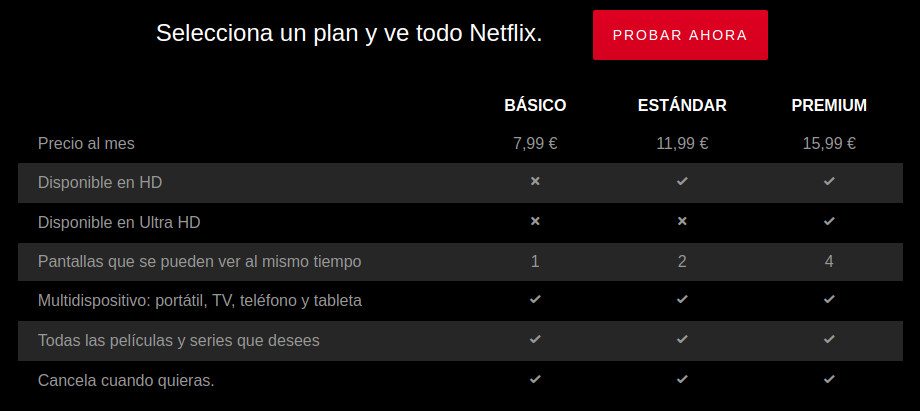 El siguiente plan, el más completo, es el Premium,. que pasa de los 13,99 € a los 15,99 y es, por lo tanto, el que experimenta un mayor encarecimiento, aunque acorde también con la escala de precios.
