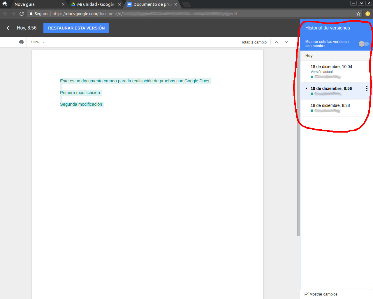 En esta, nos encontramos con dos opciones. La segunda, Ver el historial de versiones, es la que nos dará acceso a las distintas modificaciones que le hemos ido haciendo al documento a lo largo de su existencia.