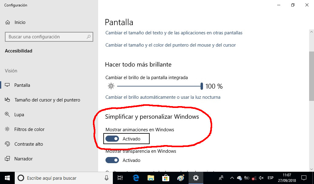 A continuación se abrirá la ventana de configuración del sistema con la opción de Pantalla ya cargada. Solamente tendremos que buscar la sección Simplificar y personalizar Windows, y desactivar la opción Mostrar animaciones en Windows: