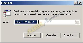 Bien, iniciaremos una sesión telnet en el router. Para ello Inicio -> Ejecutar y haremos un telnet a la ip de la puerta de enlace