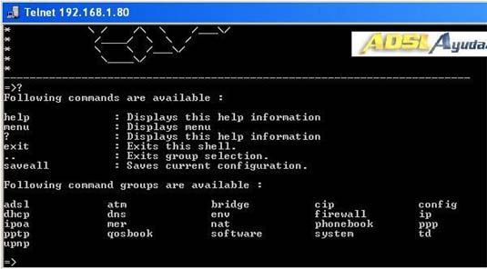 Esta es la pantalla inicial. El manejo del router puede hacerse mediante comandos o accediendo a los diferentes menús. Para un listado de las opciones disponibles teclearemos ?.