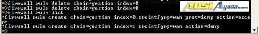 Lo más evidente es que, si queremos algo de privacidad borremos pronto las reglas 0 y 1. Para ello introducimos el comando firewallrule delete chain=gestion index=0, dos veces seguidas. Esto borrará las dos primeras reglas. Las que tenían números 2 y 3 pasarán ahora a ser 0 y 1