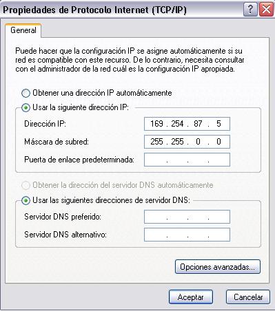 La ip de servicio del mio es 169.254.87.1, hay que asignar una al equipo en el mismo rango, yo he puesto 169.254.87.5.
