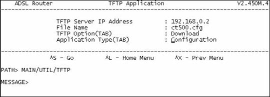 Una vez hayamos accedido a la página principal del menú de configuración del módem/router, iremos al menú MAIN/UTIL/TFTP y nos aparecerá la pantalla mostrada a continuación: