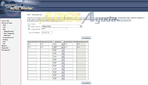 Ahora vamos a Advanced Setup–> NAT –> Virtual Servers y pulsamos Add