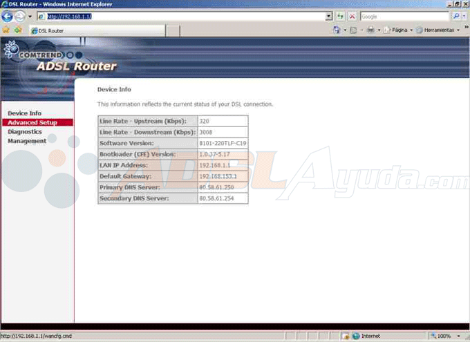 Luego una vez dentro la primera pantalla q sale es la de status pulsaremos a la izquierda en advanced setup.