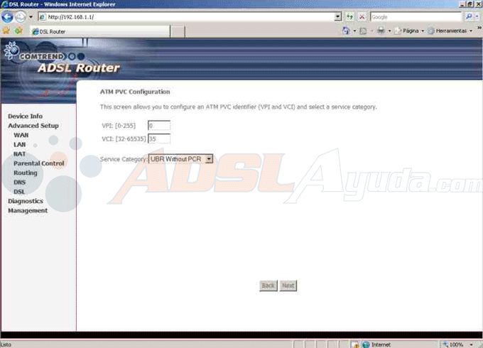 Luego pulsamos add y nos pedira valores de vpi vci q nos da el isp y marcamos ubr without pcr.