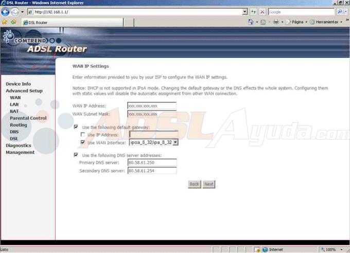 Damos a next y nos pide la ip y la mascara q nos da el isp.