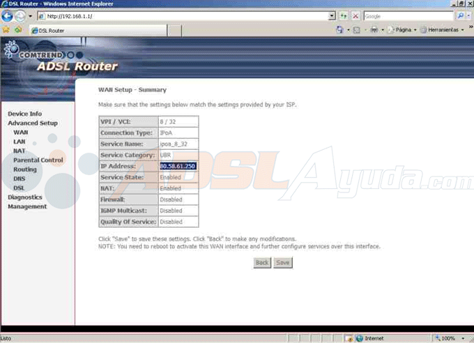 damos a next y marcamos enable nat y enable wan service y damos a next finish y listo solo falta darle a save /reboot