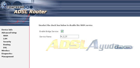 Ponemos los valores VPI y VCI. Lo demás como está en pantalla. Pulsamos Next. En la siguiente pantalla configuramos tal y como está en la imagen: