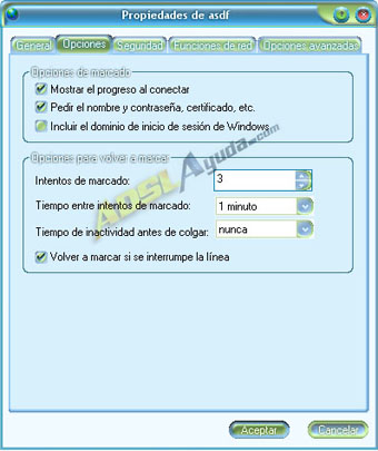 Y por último, para que no se desconecte pasados 20 minutos de inactividad, pulsaremos el botón Configuración y luego en Opciones avanzadas. Quitaremos la marca de las casillas Desconectar si está inactivo más de xxx minutos y Desconectar cuando la conexión no se necesite más.