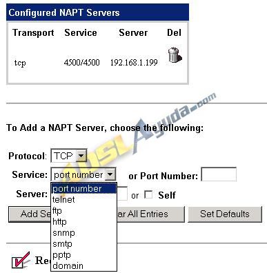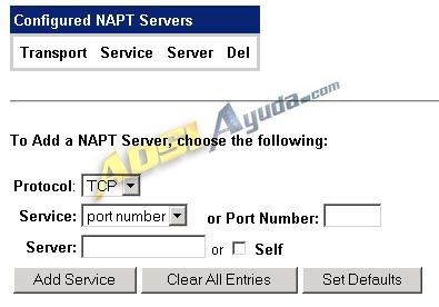 Seleccionamos Configure NAPT Servers y, por fin, llegamos a la página en la que introduciremos los puertos que queramos abrir: