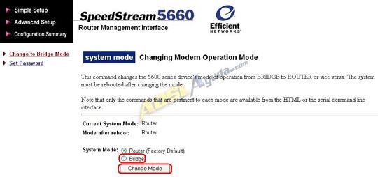 Pulsamos en la opción Change to Bridge Mode del menú de la izquierda.