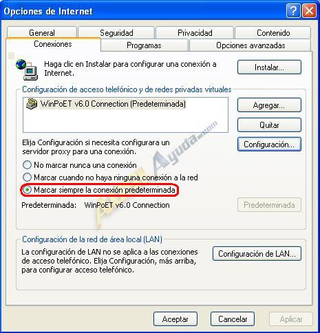 1.- La primera consiste en que el ordenador conecte a internet cada vez que se lo solicitemos. Para ello en el navegador iremos a Herramientas -> Opciones de Internet -> Conexiones, seleccionaremos WinPoET como conexión predeterminada y activaremos la casilla Marcar siempre la conexión predeterminada. De esta manera, cada vez que abramos el navegador, nos preguntará si queremos conectar (en el caso de que no lo estemos ya) y frecuentemente nos preguntará si queremos desconectar cuando lo cerremos.