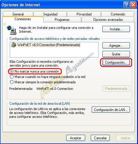 Ahora configuraremos la conexión a Internet de la siguiente manera: En el navegador iremos a Herramientas -> Opciones de Internet -> Conexiones, marcaremos la casilla No marcar nunca una conexión.