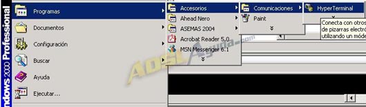 Abriremos el programa Hyperterminal, que viene incluido en windows (salvo en windows 98, en el que hay que instalarlo desde el cd original). Lo buscamos en Inicio -> Programas -> Comunicaciones -> Hyperterminal.