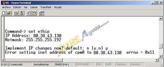 Es posible que nos dé un error al introducirla si no hemos seguido el orden que estamos llevando, pero el valor quedará guardado. Lo podemos comprobar volviendo a introducir el comando set ethip.