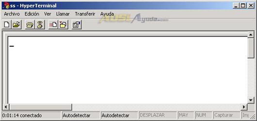 Pulsamos nuevamente en Aceptar. Entraremos en la pantalla blanca del hyperterminal y aparecerá el cursor parpadeando.