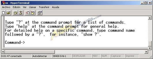 En el ejemplo se usará el programa Hyperterminal, que es un componente de los sistemas windows. El procedimiento sería análogo para cualquier otro sistema operativo con un programa similar.