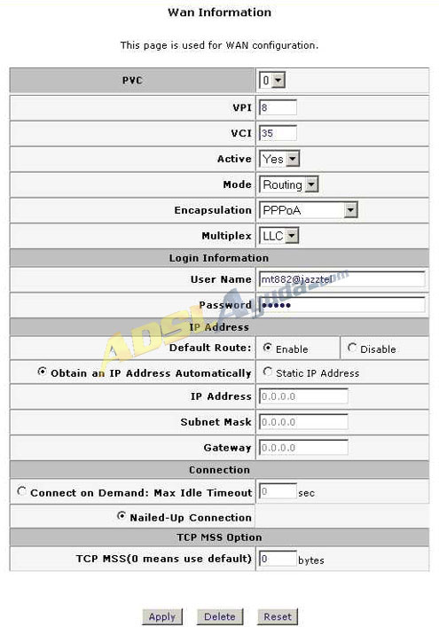 Nos hiremos a Login Information, en el campo User Name introducideremos nuestro nombre de usuario y en el campo Passwordintroduciremos nuestra contraseña de conexión, dichos datos se encuentran en la carta de bienvenida que nos envia nuestro proveedor de Internet junto al dispositivo de conexión.
