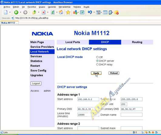 (Aplicar). Seguidamente en DHCP server setting (Configuración del servidor DHCP) rellenamos Start address(Dirección inicio) introducimos 192.168.0.2, en Subnet Mask (Mascara subred) introducimos 255.255.255.0, en Range size introducimos 253, en primary DNS (DNS primaria) introducimos la que nos haya dado nuestro ISP, em Secondary DNS (DNS secundaria) igual que en la primaria la que nos haya dado nuestro ISP y en Lease time (tiempo de asignación de una IP) Introduciremos la cantidad de tiempo que deseemos en minutos 10080 (7 días), pulsamos click en el botón