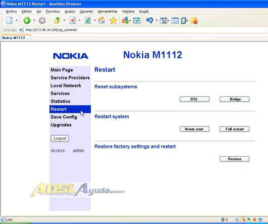 Nos aparecerá la Main Page del Nokia M1112 donde nos informará del estado de la conexión (DSL status), tiempo de conexión (Uptime),versión de firmware (SW appt. version), número de serie (Serial number), etc. Seguidamente hacemos click en Local Network