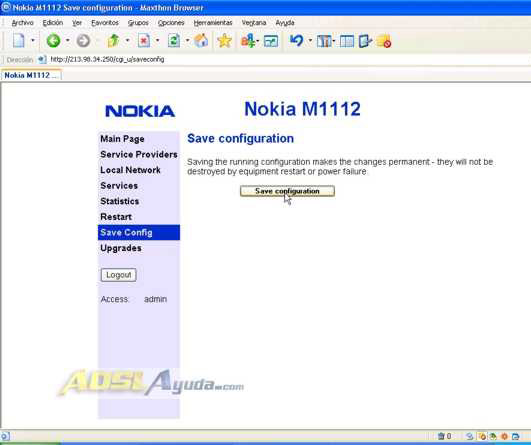 Seleccionamos en el menú de la izquierda la opción Save Config (Grabar configuración) y hacemos Click en el botón Save configuration(Grabar configuración).