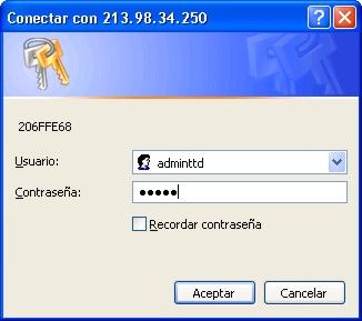 A continuación una vez introducida la puerta de enlace predeterminada nos aparecera el interfaz de usuario para que introduzcamo Usuario:adminttd y Contraseña: adminttd, hacemos click en Aceptar