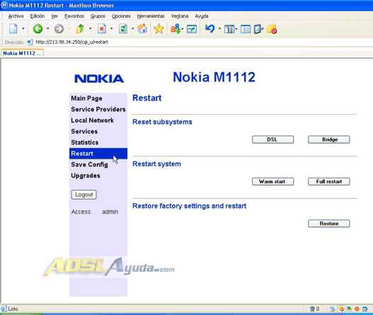 Nos aparecera la Main Page del Nokia M1112 donde nos informará del estado de la conexión (DSL status), tiempo de conexión (Uptime),versión de firmware (SW appt. version), número de serie (Serial number), etc. Seguidamente hacemos click en Restart (Reinicialización)