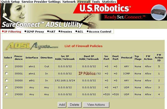 La regla 5 se ha añadido para permitir las comunicaciones por la interface ATM1, a todas las direcciones ip, para todos los puertos, en todos los protocolos en dirección salida.