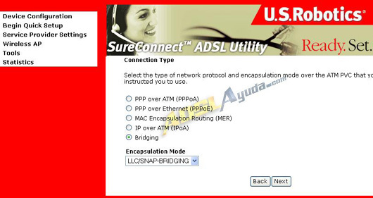 Seleccionaremos la opción Bridging. En el desplegable Encapsulation Mode dejamos el valor LLC/SNAP-BRIDGING. Pulsamos en la tecla Next.
