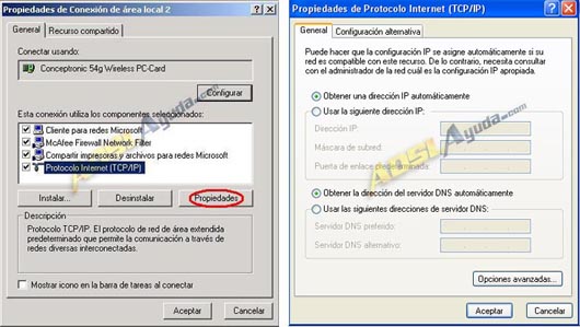 Para configurarla de forma automática, simplemente marcaremos las opciones Obtener una dirección IP automáticamente y Obtener la dirección del servidor DNS automáticamente.