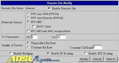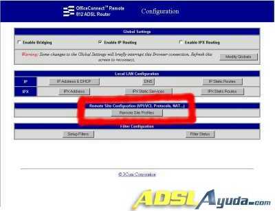 Entramos en otra pantalla, y en esta escogemos la opción Remote Site Configuration (VPI/VCI, Protocols, NAT …) haciendo click en el botón Remote Site Profiles, que es la zona coloreada de la pantalla: