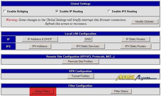 Hasta aquí todo perfecto. Pero llega el momento de que queremos usar el router de una manera más flexible, y nos enteramos de que el chisme este trae unas cosas que se llaman filtros y que nos impiden configurarlo a nuestro gusto. Lo más probable es que una vez que sabemos que existen, queramos eliminarlos.