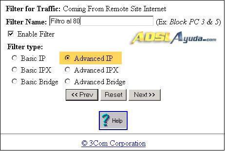 Ahora le ponemos un nombre para identificarlo. En este ejemplo vamos a filtrar el puerto 80 TCP. Seleccionamos la opción Advanced IP, dejamos marcada la casilla Enable Filter y pulsamos en Next.