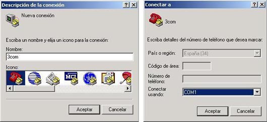 Al iniciarse el programa nos pide un nombre para la conexión, le ponemos cualquiera, le decimos que conecte por el com1 y le cambiamos la velocidad de conexión a 9600.
