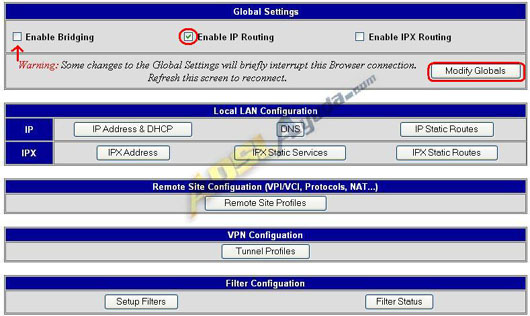 En la pantalla general de configuración, ya tendremos que empezar a cambiar cosas. En Globals Settings debemos quitar la marca de Enable IP Routing ymarcar Enable Bridging. Una vez hecho esto debemos pulsar el botón Modify Globals.