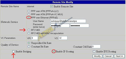 Esta pantalla habrá sufrido un cambio con respecto a la que teníamos configurada con PPPoE, ya que en la pantalla anterior le hemos dicho que el protocolo es RFC1483.