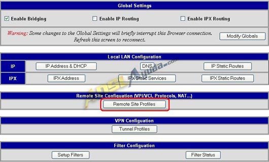 Iremos a la sección de Remote Site Profiles. Para configurar la conexión a internet.