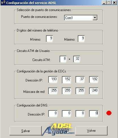 Salvar/volver y pinchamos en Configuración del servicio ADSL y lo configuramos tal como aparece en la imagen inferior, es decir copia los datos que te facilitamos a continuación porque son válidos para (Efficient como para 3Com), lo único que tienes que añadir en configuración del DNS son las que te proporcione tu proveedor. Por ejemplo para Telefónica podría ser 195.235.113.3