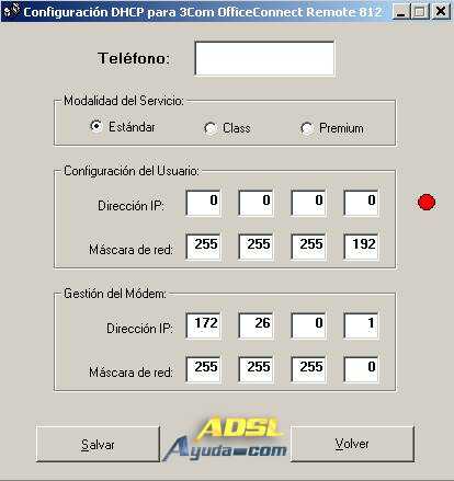 Aceptamos y nos aparecerá una pantalla en la cual tenemos que poner en primer lugar el telefóno donde se encuentra el ADSL, la modalidad del servicio que normalmente será standard (ADSL 256). En la configuración del usuario ponemos en Dirección IP IP pública. Sino sabes tu IP pincha aquí.