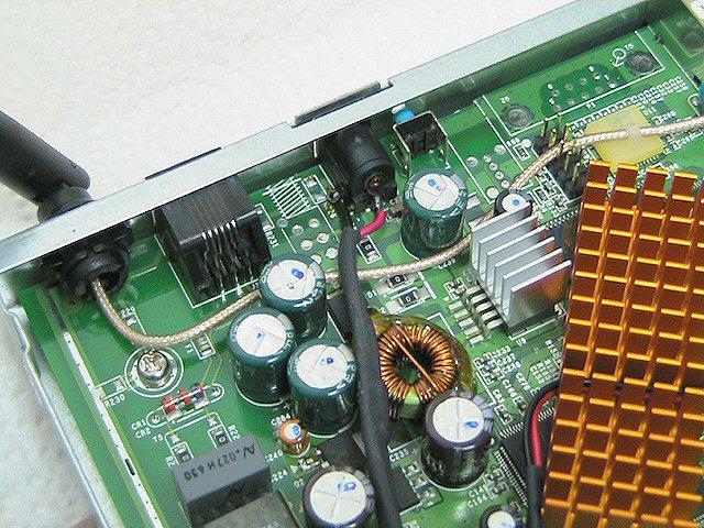 Una visión de cerca de la resistencia enfundada en funda termoretráctil y la conexión al conector de la placa. Para oír el sonido hay que pegar el oído al router.
