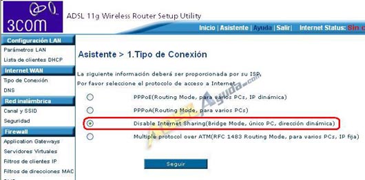 El router se abre siempre en la página del asistente de configuración. Por tanto, seleccionaremos la opción Disable Internet Sharing (Bridge Mode, único PC, dirección dinámica).