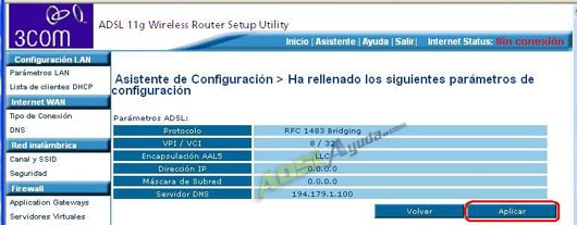En la siguiente pantalla pulsamos el botón aplicar, se guardará la configuración y volveremos a tener conexión en multipuesto para todos los pcs sin necesidad de ejecutar el cliente PPPoE.