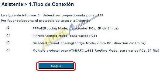 Simplemente es ejecutar el asistente otra vez, los datos de nuestra conexión siguen guardados en el router. Pulsamos en Asistente. Seleccionamos la opción del menú: PPPoE (Routing Mode, para varios PCs, IP dinñamica), pulsamos en Seguir