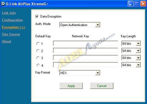 64-bit WEP: En esta opción usaremos encriptación de 64bits. Podemos generar hasta 4 claves hexadecimales, para este modo. Se puede introducir una cadena de caracteres para generar dichas claves automáticamente.