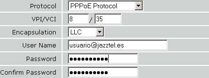 A continuación configuramos los demás datos VPI/VCI que ya vienen configurado por defecto en 8/35, el Encapsulamiento también viene por defecto LLC y por último Nombre de usuario y Contraseña de conexión, estos datos no lo manda nuestro ISP en una carta de bienvenida.
