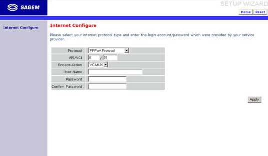 Aparece la pantalla Internet Configure que es donde configuraremos nuestra conexión.