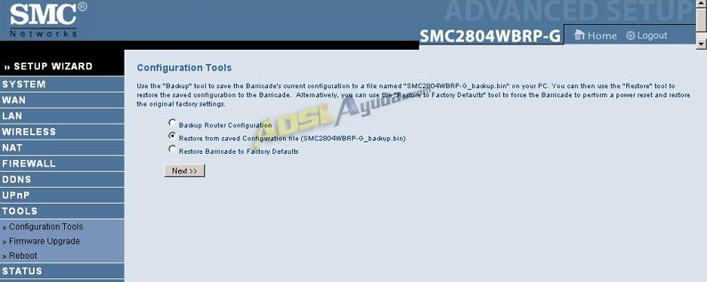 Seleccionamos la segunda opción, Restore from saved Configuration file (SMC2804WRP-G_backup.bin), y le damos al botón de Next, y nos aparecerá la siguiente pantalla: